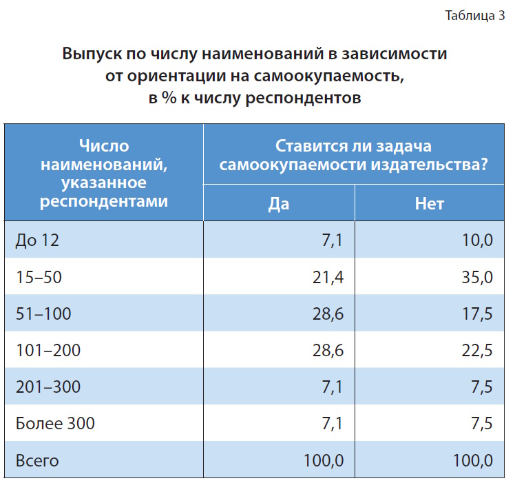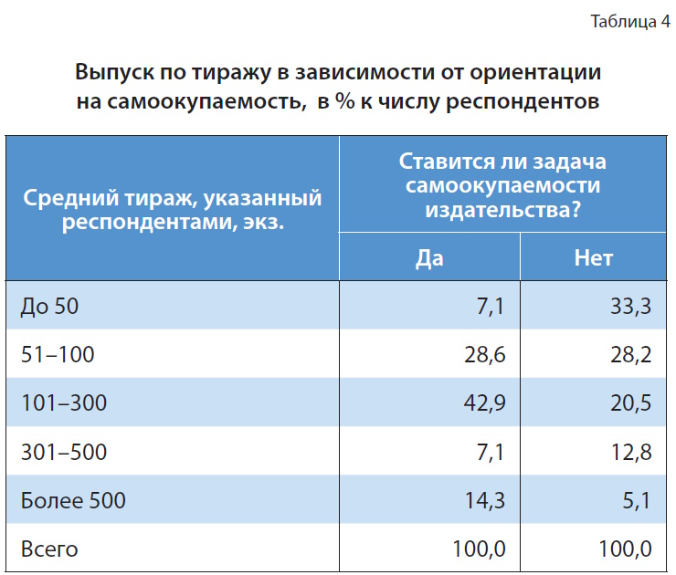 Сравнительный анализ показывает, что какой-либо явной корреляции между количеством наименований и задачей выхода на самоокупаемость не прослеживается: более 100 титулов в год выпустили (по их собственной оценке) 42,9% опрошенных, ориентированных на самоокупаемость, и 37,5% не имеющих такой задачи. Зависимость прослеживается в случае тиражей: более 100 экз. в среднем выпустили 64,3% тех, кто ставит задачу самоокупаемости, и 38,5% респондентов, не ставящих этой задачи. Очевидно, что можно выпустить меньше качественных и востребованных читательской аудиторией книг, зато бóльшим тиражом.
