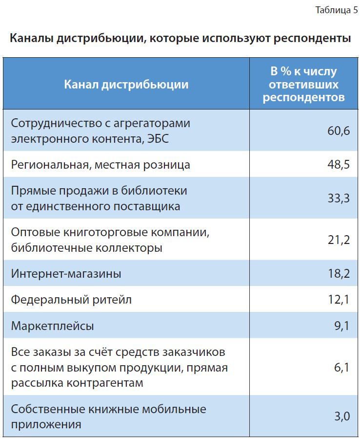 Что касается каналов дистрибьюции, используемых респондентами, то 15,4% ответивших на этот вопрос подчеркнули, что дистрибьюция не осуществляется: в приоритете обеспечение научного и учебного процессов университета. Ответы остальных представлены данными табл. 5. Как показывает анализ, в приоритете у издателей сотрудничество с агрегаторами и местная, региональная, розница.