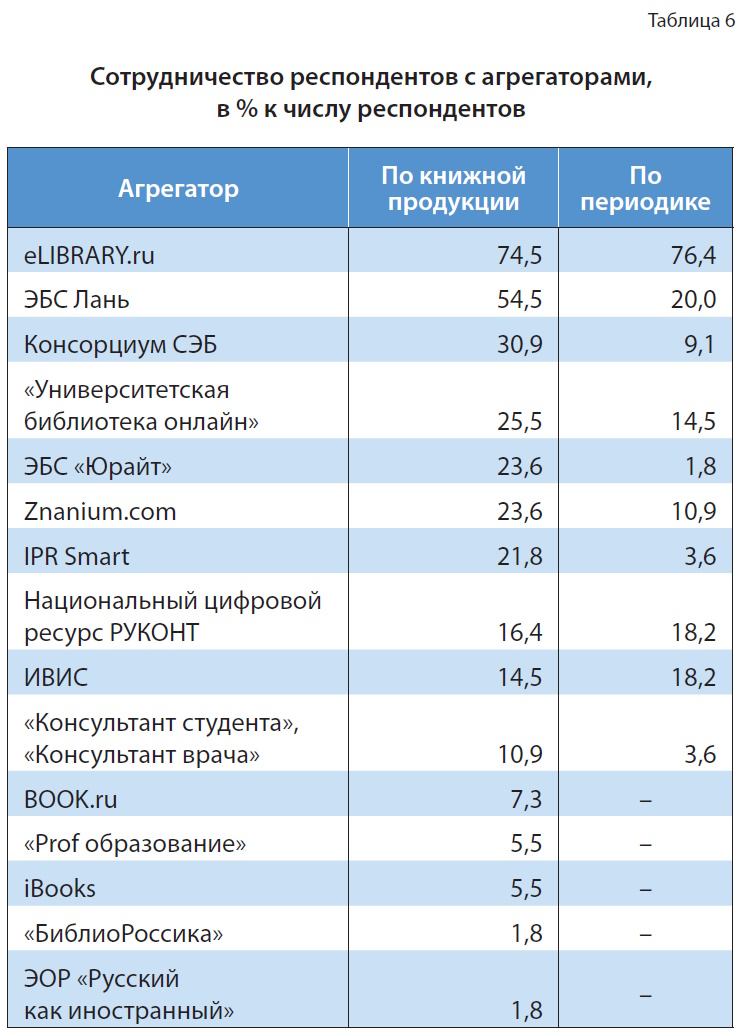 Проникновение агрегаторов электронного контента на рынок вузовского книгоиздания характеризуют данные табл. 6. Если исключить очевидный приоритет eLIBRARY.ru, основной площадки для научных книг и журналов, то из коммерческих агрегаторов лидирует Лань (54,5% поставляют в эту ЭБС книжный контент). При этом 30% сотрудничают в формате Консорциума сетевых электронных библиотек (СЭБ). Около четверти респондентов работают по книжной продукции с ЭБС «Университетская библиотека онлайн», «Юрайтом», Znanium.com.