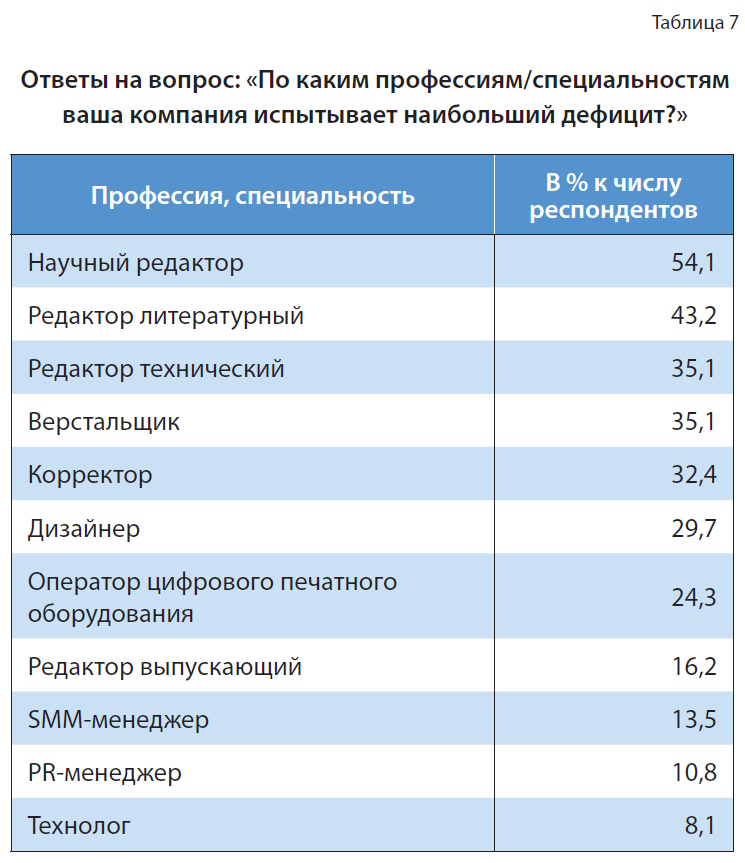 На вопрос: «Испытывает ли ваша компания дефицив специалистах?» — положительно ответили 70,4% респондентов. Перечень профессий и специальностей, в которых испытывают потребность издатели, представлен в табл. 7. Анализ показывает, что более половины респондентов нуждаются в научном редакторе, 43,2% — в литературном редакторе. Для более чем трети опрошенных актуальны технические специальности: корректор, верстальщик, техредактор.