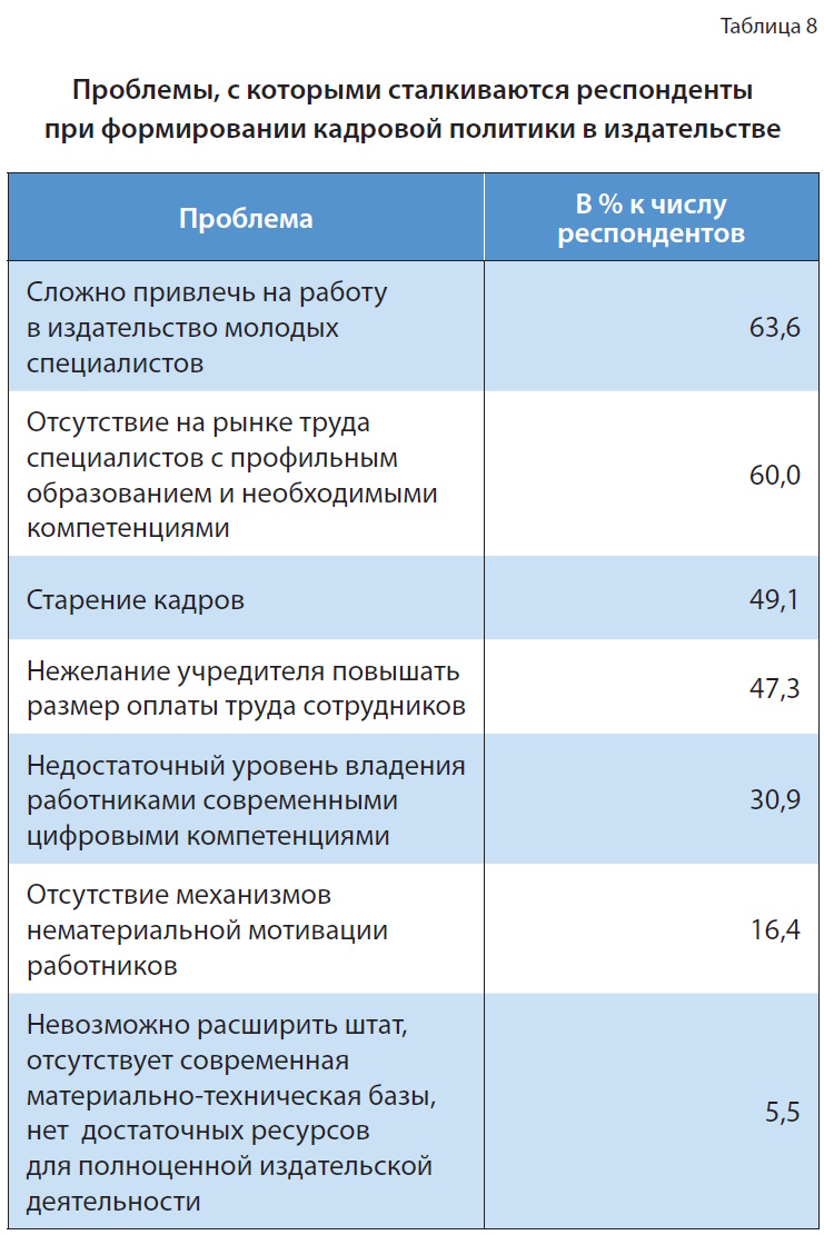 При этом опрошенные перечислили проблемы, с которыми они сталкиваются при формировании кадровой политики (табл. 8). Большинство (63,6%) сообщили о том, что сложно привлечь на работу в издательство молодых специалистов. Для почти половины, как следствие, актуальной проблемой является старение кадров. 60% респондентов обратили внимание на отсутствие на рынке труда специалистов с профильным образованием и необходимыми компетенциями. Ещё 47% отметили нежелание учредителя повышать размер оплаты труда сотрудников.